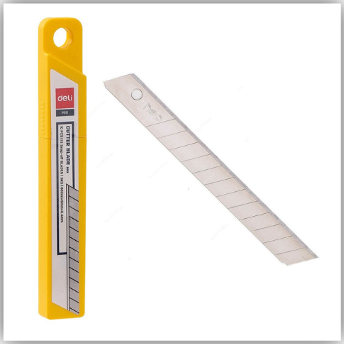 The Deli E2011 Cutter Blade comes in a convenient PP box designed for easy access and hanging storage. Each package contains 10 high-quality blades, ensuring precision and durability for your cutting tasks. Ideal for professional use, these blades offer reliable performance and safe handling.