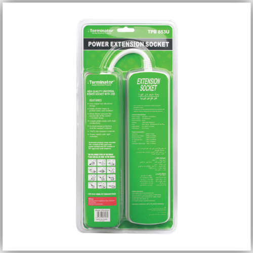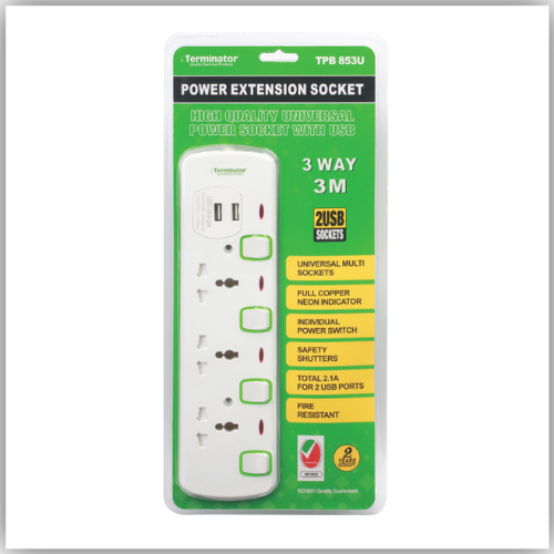 Extension Lead 3 Way Socket 3M With 2 USB, Individual Switches, Indicators - TPB 853U
