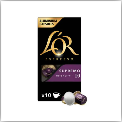 Experience the bold taste of L’OR Espresso Supremo, crafted for coffee lovers who enjoy deep, intense flavors. With an intensity level of 10, Supremo delivers a powerful espresso with rich aroma, dark roasted notes, and a velvety crema. Perfect for a strong morning boost or an indulgent espresso moment.