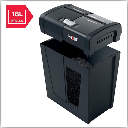 - 18L (150 A4 sheets) bin capacity with a lift off shredder head. Transparent bin window to see when full.